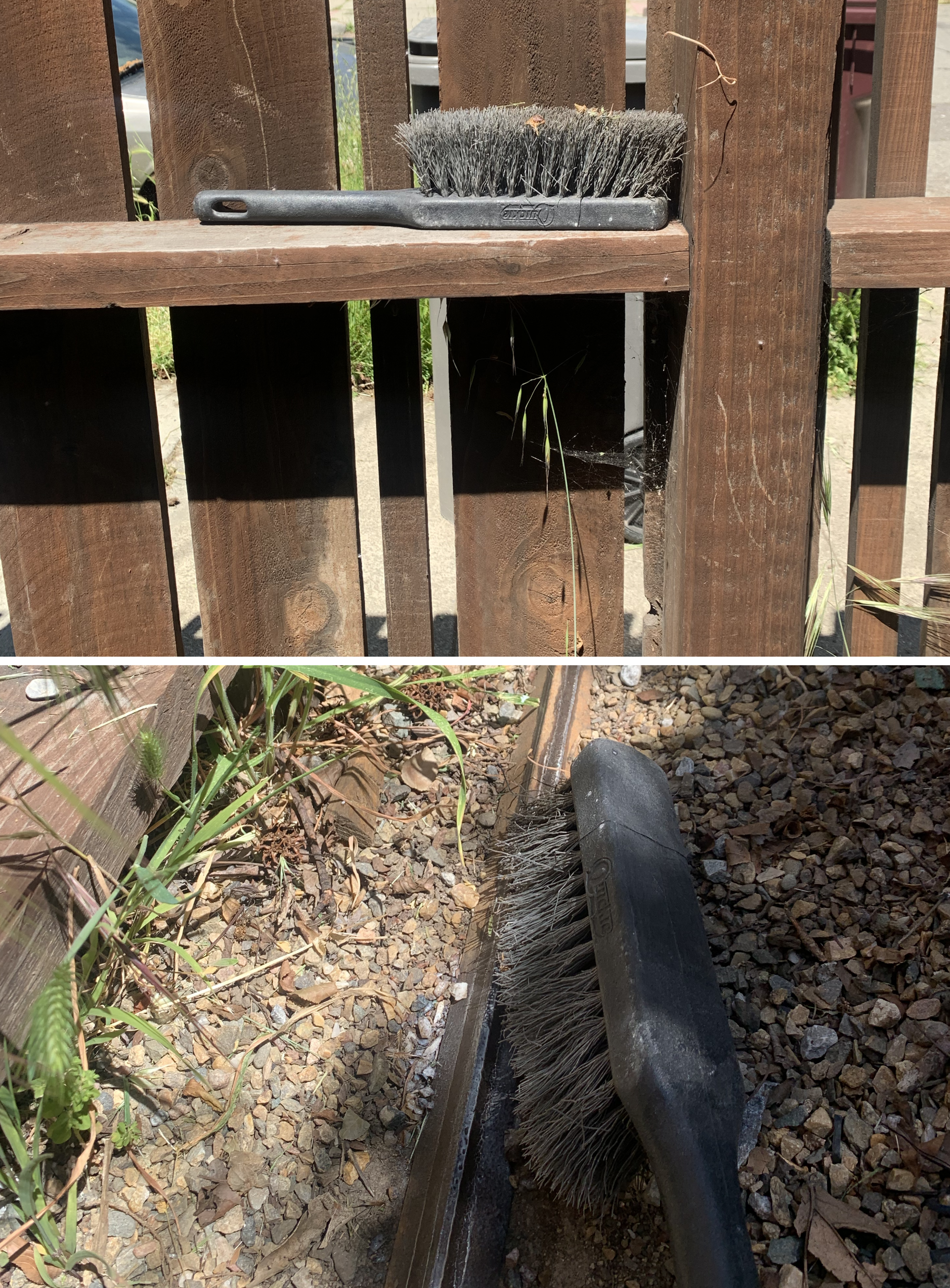 The front gate runs on a track that needs to be cleared pretty regularly. The brush above is at the fence and we recommend sweeping the track weekly.